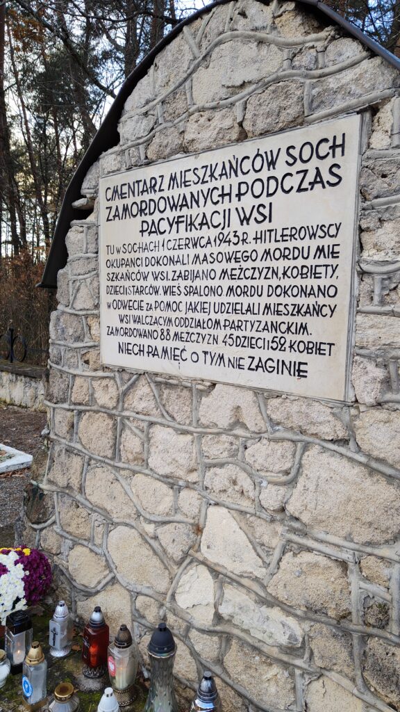 Z Bukowej Góry zeszliśmy do Soch, małej wioski leżącej u jej podnóża. 1.VI. 1943 roku Niemcy spacyfikowali tę wioskę, mordując wszystkich mieszkańców. Oddaliśmy hołd pomordowanym nawiedzając cmentarz.