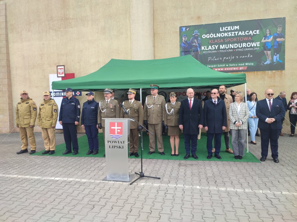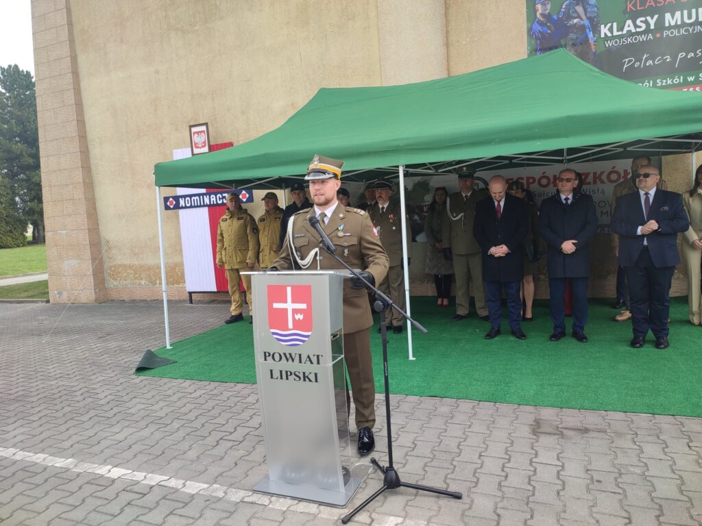 Punktualnie o godz. 12. 00 przy słonecznej pogodzie, która w tym roku nie zawiodła, na szkolnym placu zgromadzili się uczniowie, nauczyciele, rodzice i bliscy czwartoklasistów oraz zaproszeni goście. Swą obecnością spotkanie uświetnili: Starosta Powiatu Lipskiego pan Jakub Ochyński, Wicestarosta, pan Paweł Jędraszek, Urzędujący Członek Zarządu pani Weronika Szumlak, ppłk Łukasz Jędrzejczak z 1. Warszawskiej Brygady Pancernej, ppłk Marcin Drwal z 4. Pułku Saperów z Dęblina, kpt. Radosław Kwiatek, komendant placówki Straży Granicznej w Radomiu, ppor. Bernadetta Nędzi z Wojskowego Centrum Rekrutacji w Radomiu, kpt. Emil Kopeć, reprezentujący dowódcę 6. Mazowieckiej Brygady Obrony Terytorialnej z Radomia, zastępca Komendanta Powiatowego PSP w Lipsku bryg. Paweł Niewczas, Prezes OSP w Solcu nad Wisłą, dh Łukasz Łyczkowski oraz radny Rady Powiatu Lipskiego pan Piotr Pawłowski. Komendanta Powiatowego Policji w Lipsku reprezentowali na uroczystości nadkom. Jarosław Stępień oraz mł. asp. Karolina Mendyk. Swoim przybyciem na Nominację miłą niespodziankę zrobił maturzystom Tomasz Wielicki, uczący klasy policyjne we wcześniejszych latach.